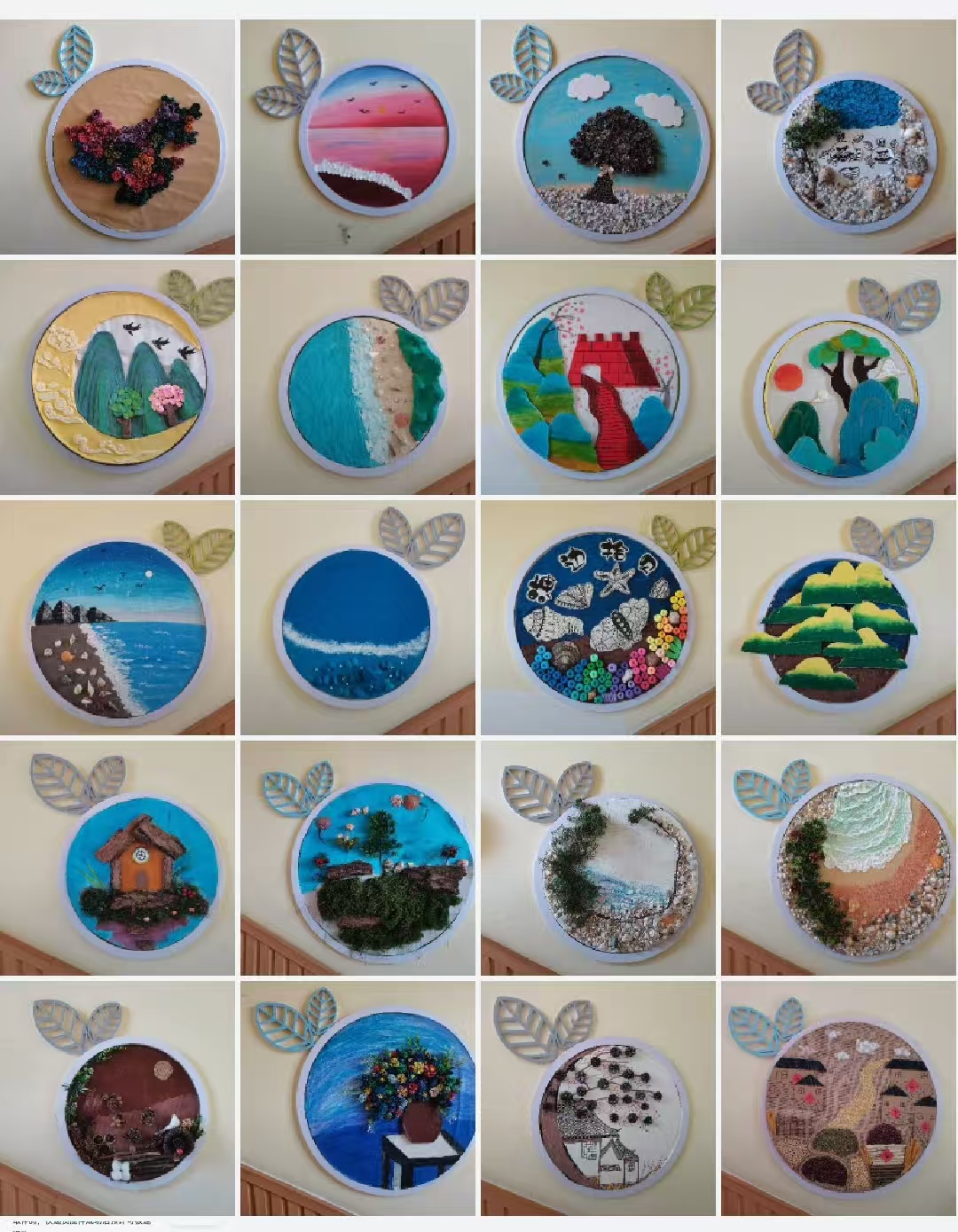 活動(dòng)中,教師們走進(jìn)桃花澗自然景區(qū),收集散落的松果、枯枝等天然材料,將山海傳說(shuō)中的清廉意象與手工創(chuàng)作相結(jié)合。大家充分發(fā)揮創(chuàng)意,把松果、枯樹枝等自然材料打磨、拼接、彩繪,制作成一個(gè)個(gè)寓意“圓滿廉潔”的圓形環(huán)創(chuàng)作品。幼兒園已將這些環(huán)創(chuàng)作品布置在走廊、活動(dòng)室等區(qū)域,打造“廉潔文化長(zhǎng)廊”。孩子們?cè)谟^賞、觸摸中感受自然與藝術(shù)的融合,潛移默化地接受清廉文化的熏陶。