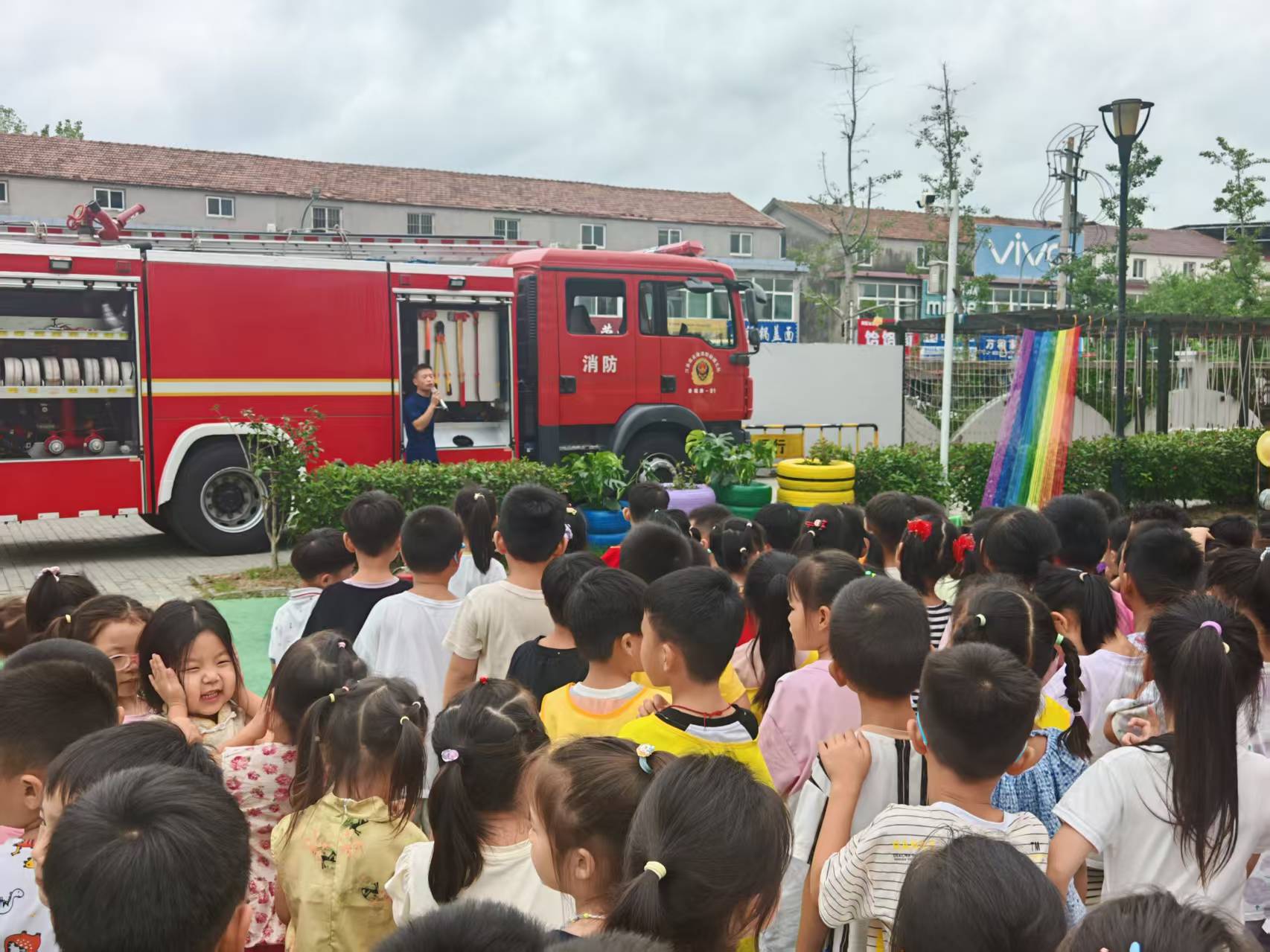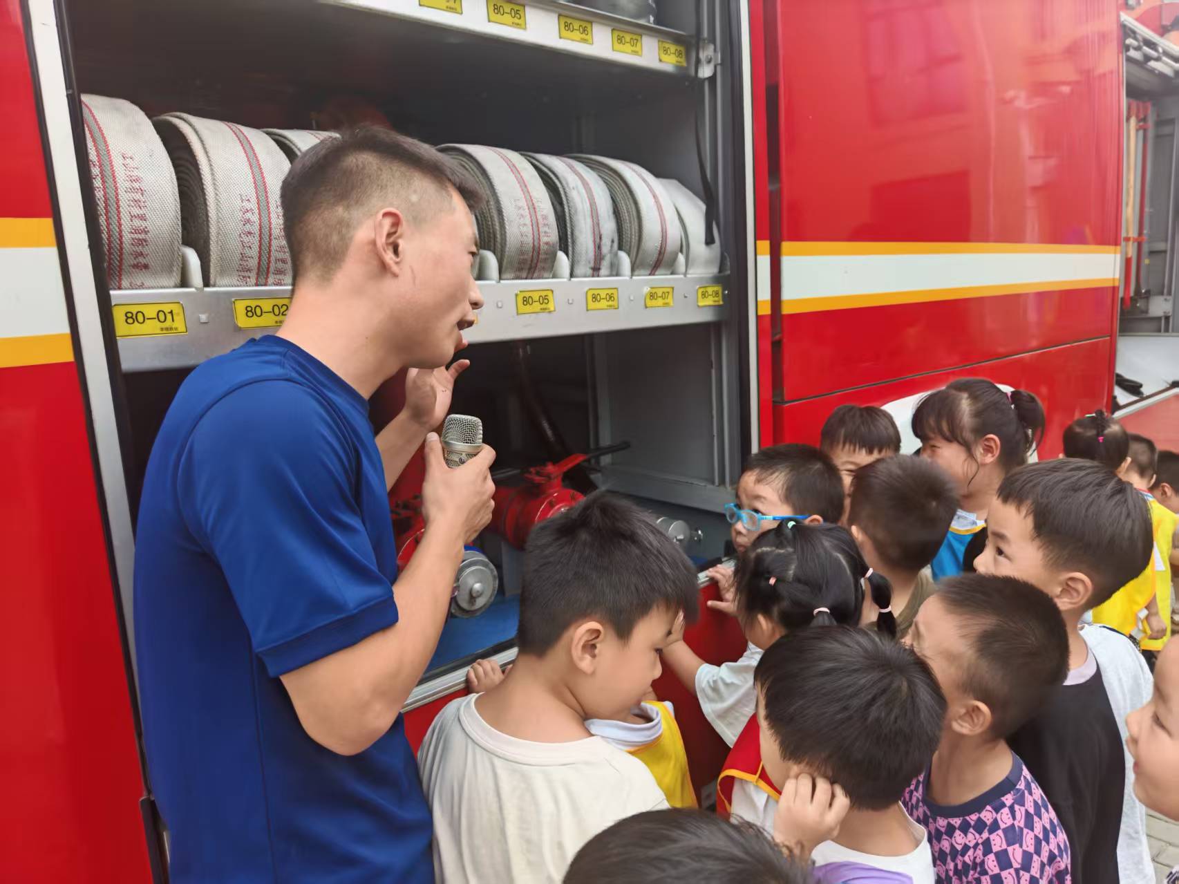 最讓孩子們興奮的是近距離參觀消防車的環(huán)節(jié)。高大的紅色消防車像一座神秘的堡壘,消防員耐心地打開車上的一扇扇門,向好奇的孩子們展示了車內(nèi)的各種裝備器材,如高壓水槍、消防水帶、破拆工具等,并簡要講解了它們的用途。孩子們睜大了眼睛,認(rèn)真聆聽,不時發(fā)出陣陣驚嘆。
