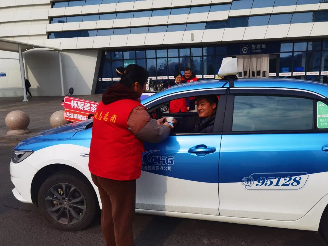 連云港站送客平臺上,志愿者們把姜茶送到出租車司機手上,感謝他們為旅客平安出行付出的努力。司機們喝著熱茶,感謝志愿者的無私奉獻,并說道今后要向志愿者學習,盡自己所能幫助更多需要幫助的人。