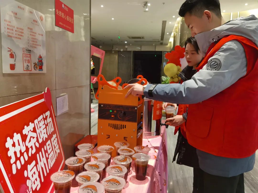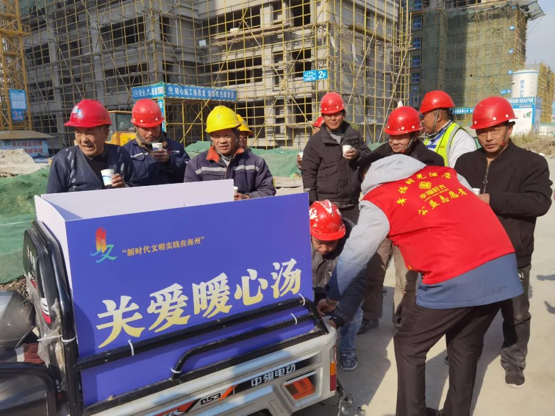 萬象新海東苑工地機器轟鳴,一杯杯姜茶被送到正在施工的工人手中。工人們連聲道謝,表示這是自己在寒冬收到最特別的禮物,感到特別開心。志愿者們叮囑他們要注意防寒保暖,做好自我防護。